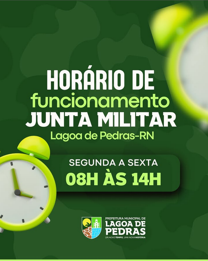 Horário de Funcionamento – Junta Militar Segunda a sexta | 08h às 14h Atendimento na sala ao lado da Prefeitura Municipal de Lagoa de Pedras. Mantenha suas obrigações militares em dia!