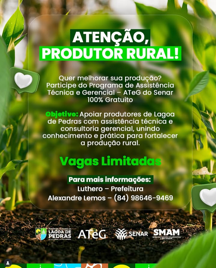 Atenção, produtores rurais de Lagoa de Pedras!Chegou a oportunidade de fortalecer ainda mais sua produção. Participe do Programa de Assistência Técnica e Gerencial – ATeG do Senar, 100% gratuito! Consultoria técnica e gerencial Conhecimento + prática para aumentar a produção Vagas limitadas! Para mais informações, entre em contato com:Luthero – PrefeituraAlexandre Lemos – (84) 98646-9469