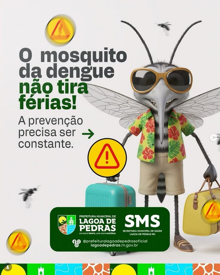 Atenção redobrada contra a dengue! O mosquito não tira férias e a prevenção precisa ser diária.Eliminar água parada, manter reservatórios bem tampados e cuidar do nosso ambiente são atitudes simples que salvam vidas. Faça sua parte todos os dias.Vigilância constante é a chave para a prevenção!