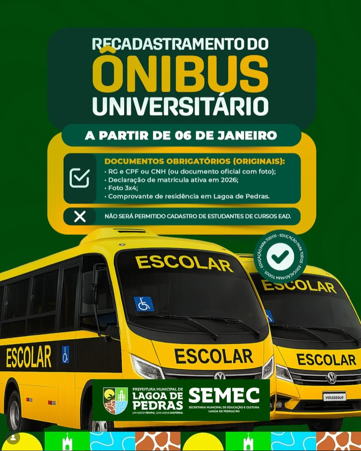 Atenção, estudantes universitários! O recadastramento do Ônibus Universitário começa a partir do dia 06 de janeiro.É importante ficar atento aos documentos obrigatórios …