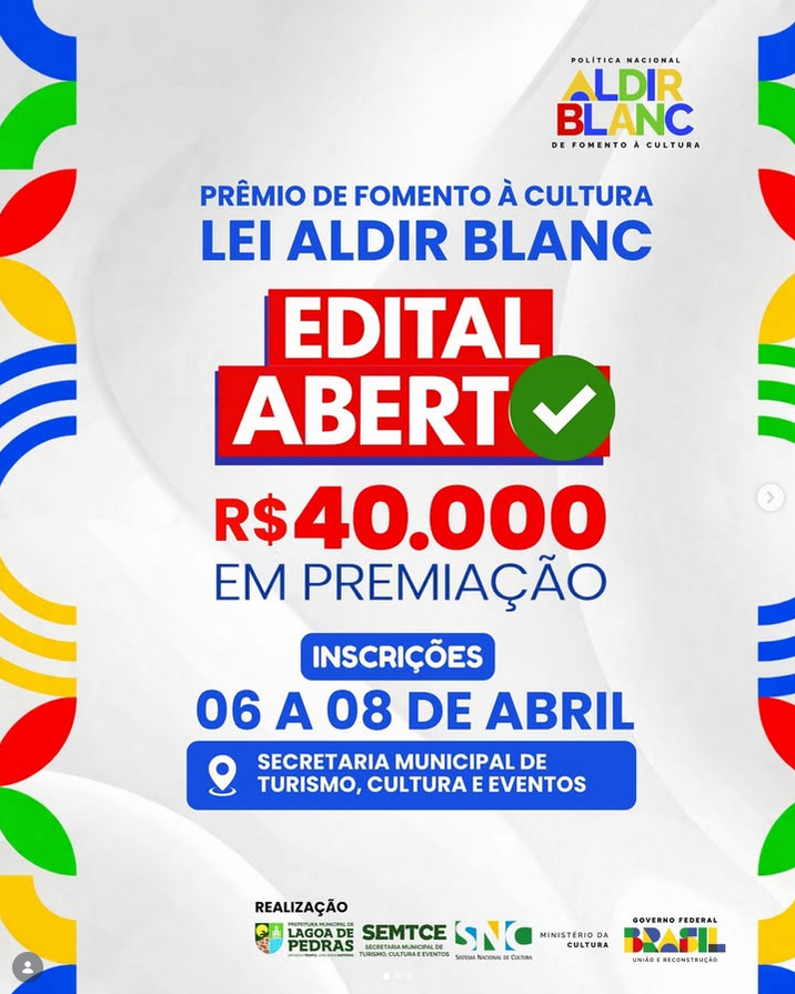 Está aberto o edital da Lei Aldir Blanc, com R$ 40 mil em premiação para incentivar artistas, produtores e fazedores de cultura …