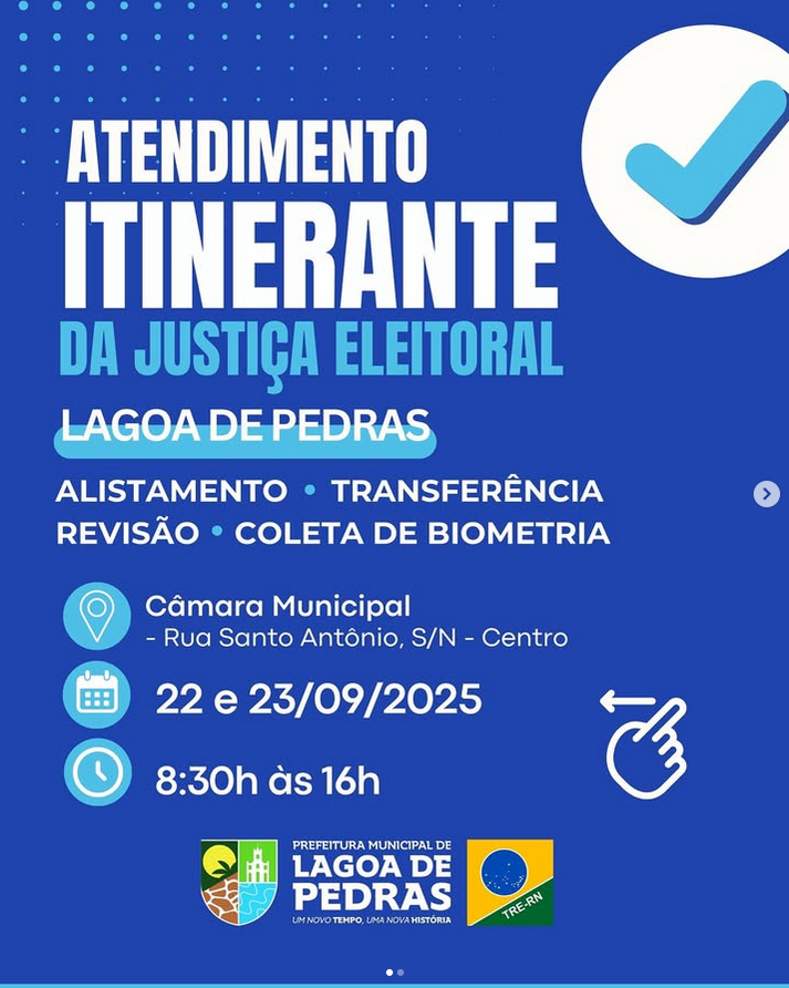 Nos dias 22 e 23 de setembro acontecerá o atendimento itinerante no nosso município. Durante esse período, a população poderá fazer alistamento, transferência, revisão e coleta de biometria.