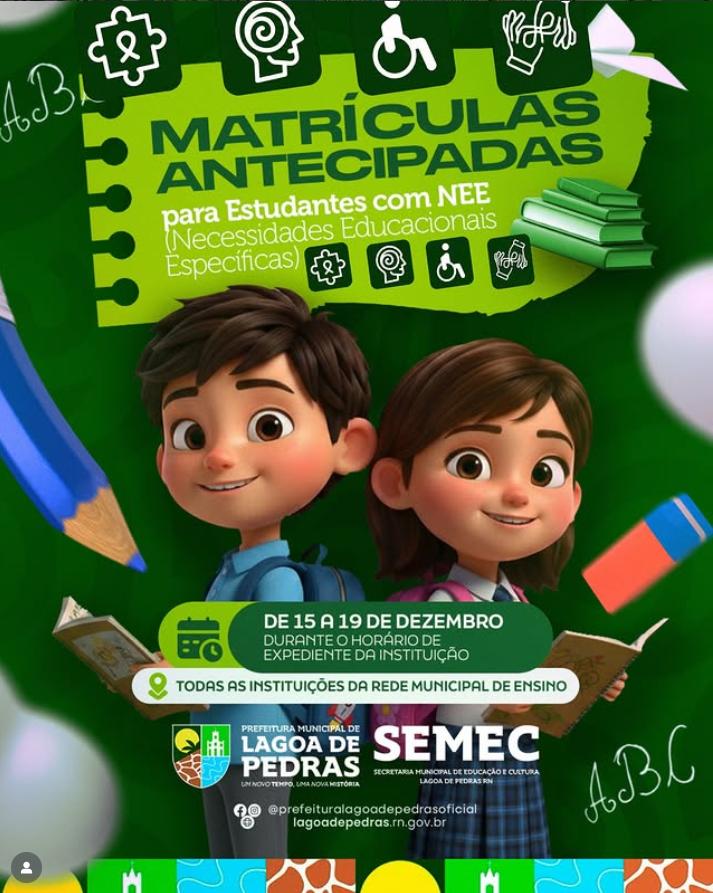 Matrículas Antecipadas para Estudantes com NEENecessidades Educacionais Específicas De 15 a 19 de dezembro Garantindo inclusão, cuidado e o direito à educação para todos na rede municipal de Lagoa de Pedras. Procure as instituições da rede municipal de ensino durante o horário de expediente.
