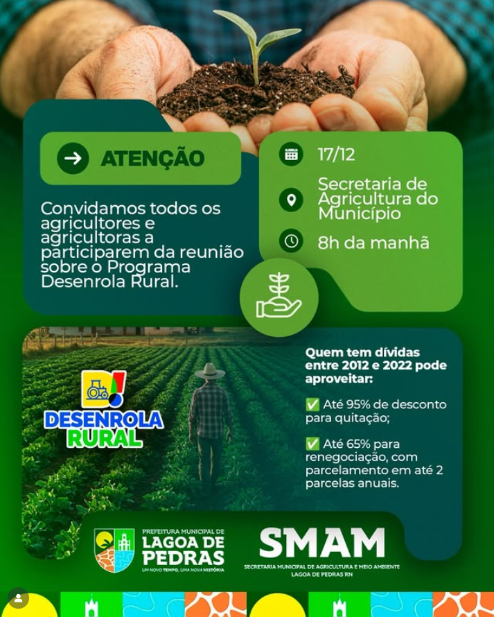 ATENÇÃO!Convidamos todos os agricultores e agricultoras a participarem da reunião sobre o Programa Desenrola Rural. Dia: 17/12 Local: Secretaria de Agricultura do Município Horário: 8h da manhã Quem tem dívidas entre 2012 e 2022 pode aproveitar: até 95% de desconto para quitação até 65% para renegociação, com parcelamento em até 2 parcelas anuais