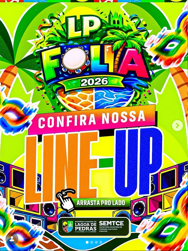 CONFIRA A LINE-UP DO LP FOLIA 2026! Minha gente… a programação desse ano tá PRESSÃO, viu?! Vai ter música, energia, tradição e muita alegria pra Lagoa de Pedras! Arrasta pro lado e confere os horários!