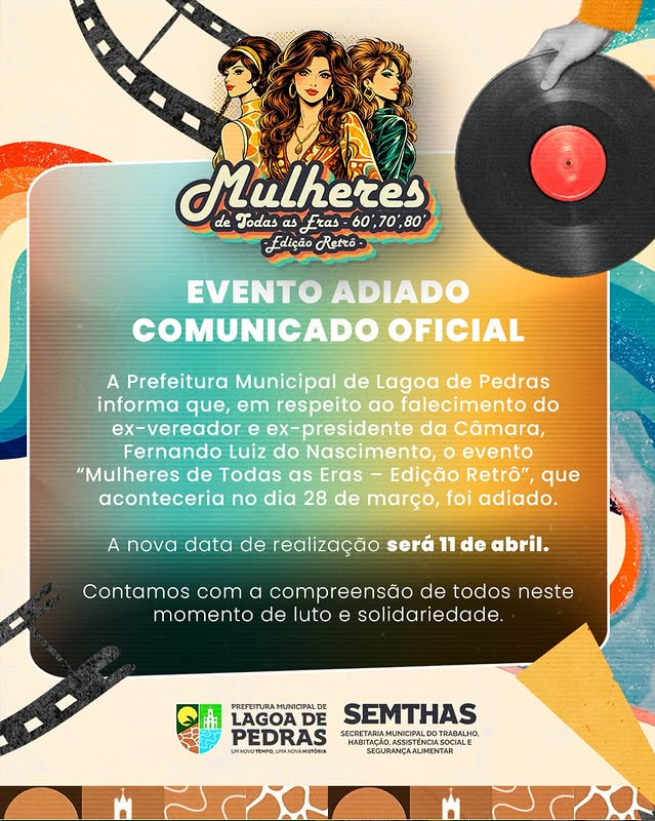 EVENTO ADIADOCOMUNICADO OFICIAL A Prefeitura Municipal de Lagoa de Pedras informa que, em respeito ao falecimento do ex-vereador e ex-presidente da Câmara, Fernando Luiz do Nascimento, o evento “Mulheres de Todas as Eras – Edição Retrô”, que aconteceria no dia 28 de março, foi adiado. A nova data de realização será 11 de abril. Contamos […]