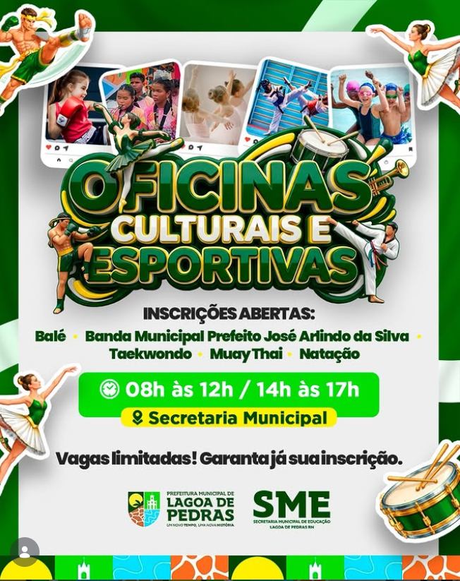 Estão abertas as inscrições para as Oficinas Culturais e Esportivas! Modalidades: Balé, Banda Municipal, Taekwondo, Muay Thai e Natação. Inscrições na Secretaria Municipal de Educação 08h às 12h | 14h às 17h Vagas limitadas! Garanta já a sua.