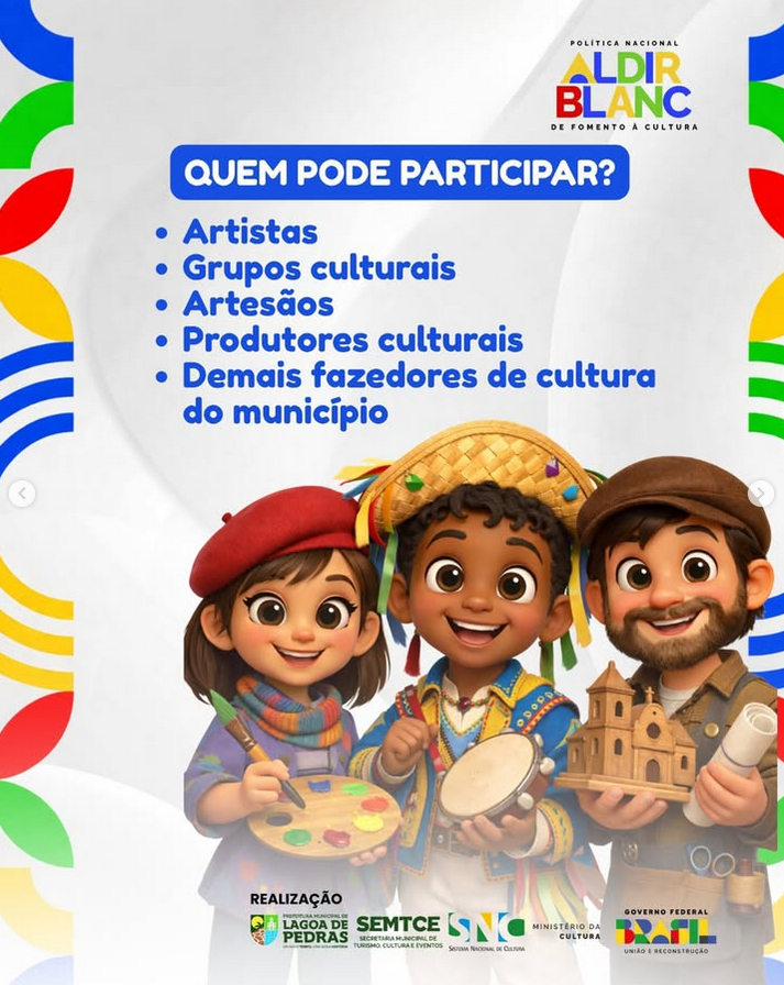 Está aberto o edital da Lei Aldir Blanc, com R$ 40 mil em premiação para incentivar artistas, produtores e fazedores de cultura do nosso município.