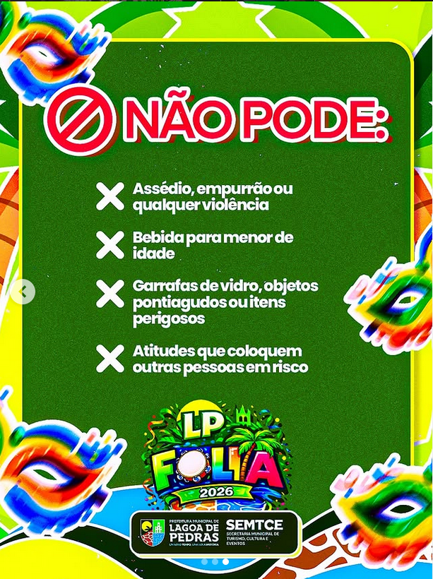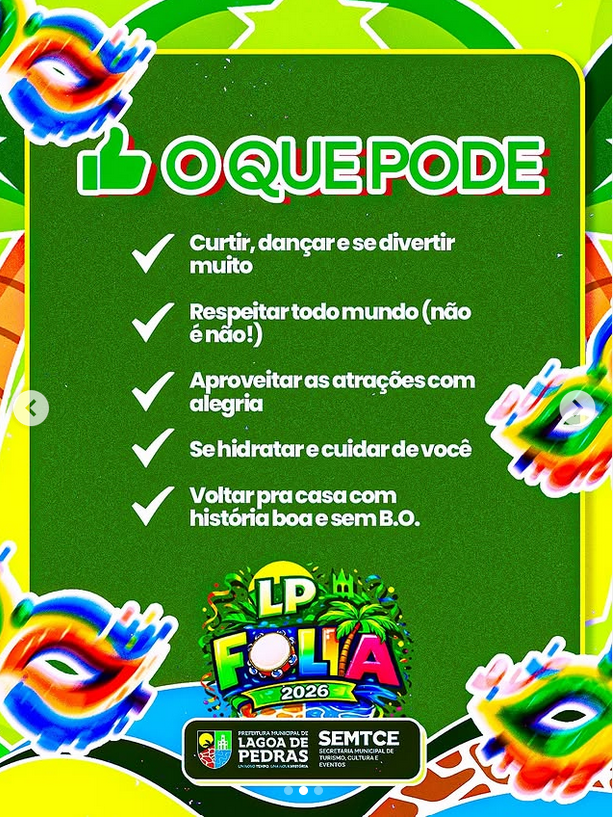 No LP Folia, o combinado é claro! O que pode: curtir, dançar e se divertir com respeito. O que não pode: assédio, violência e atitudes que coloquem alguém em risco. Carnaval é alegria, sem B.O. e com responsabilidade!
