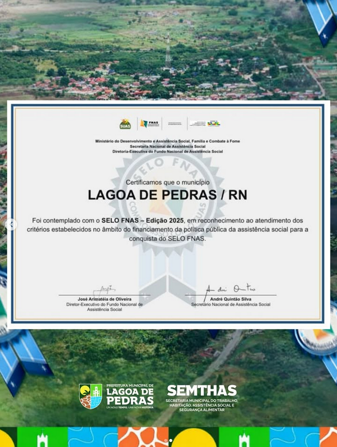 O Município de Lagoa de Pedras conquistou o Selo FNAS – Edição 2025, uma certificação federal que reconhece a excelência, transparência e eficiência na gestão dos recursos do Sistema Único de Assistência Social (SUAS).